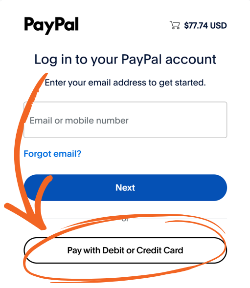 If paying with a credit card, please know that you do not need to have a PayPal account to complete the transaction. Click the button to proceed with payment and, instead of logging into PayPal, click the Pay by Credit/Debit Card button.